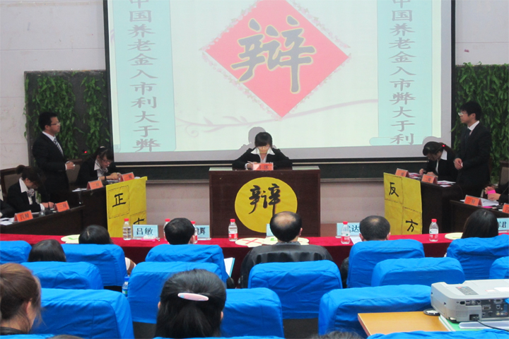 ,辩题为“在中国养老金入市是利大于弊,还是弊大于利”。比赛开始,双方一辩用具有高度概括性的陈述为本场辩论赛开篇立论。然后,攻辩环节双方二辩彼此反驳。赛场气氛紧张激烈,双方辩手争锋相对,唇枪舌剑,你来我往,却不失风度,侃侃而谈。比赛的自由辩论阶段,可以说是本场辩论的高潮。面对正方同学的旁征博引,反方的辩手们则巧用四两拨千斤的方法,一次次化险为夷。继短暂而精彩的观众提问环节后,比赛进入总结陈词环节,双方四辩各自针对对手逻辑上的漏洞逐一回击,为赢得比赛做最后努力。