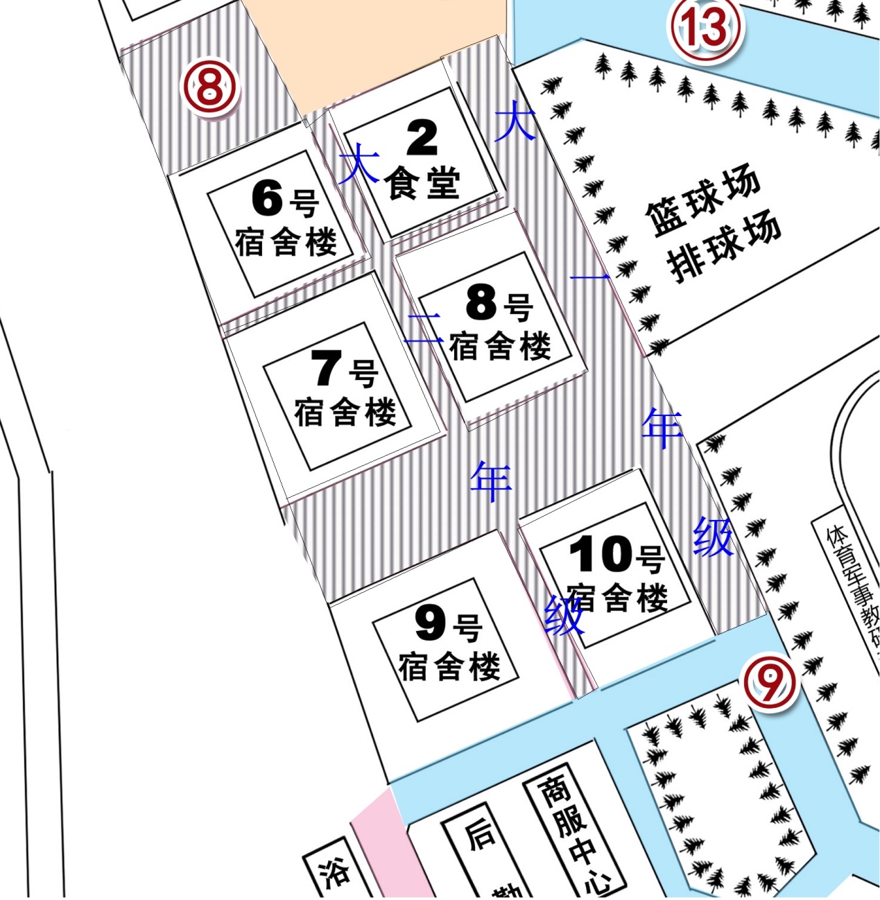 我院扫雪地点主要集中与二食堂至九号寝室楼,如下图: