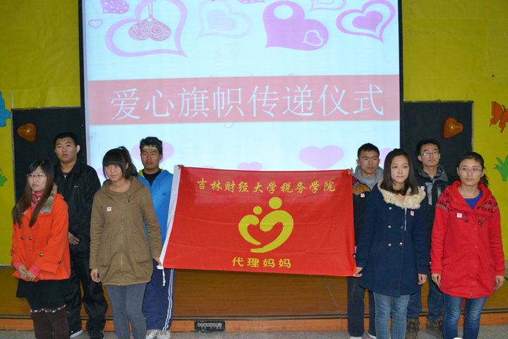 随后进行爱心旗帜传递仪式,12级代表从11级代表手中郑重接过旗帜并宣誓。在一声声“以传递爱心为使命,以奉献爱心为己任”的话语中,新一届的“代理妈妈”们又启程了,他们将继续发扬当代大学生的优良品质,把爱心与希望传递下去。最后,在被代理儿童陈科戌小朋友和12级王丽婧、姜明晓同学共同演唱的《隐形的翅膀》歌声中,本次活动圆满结束。