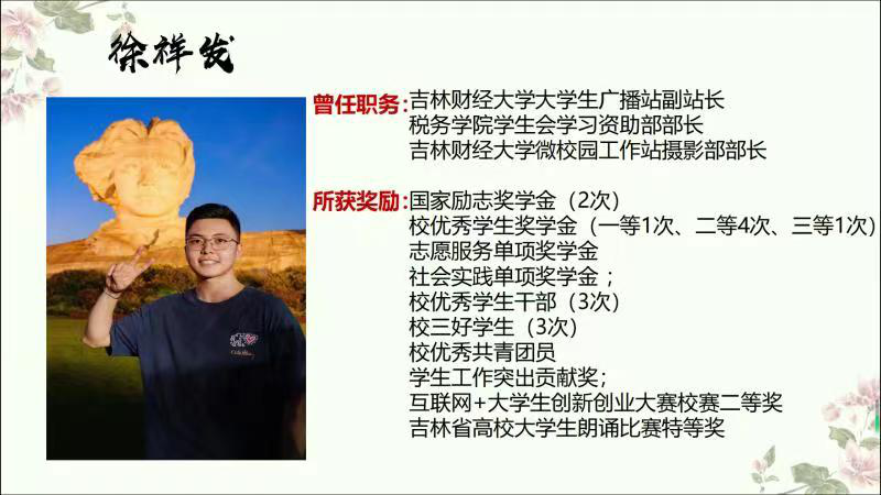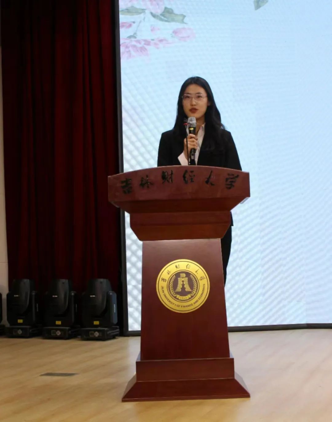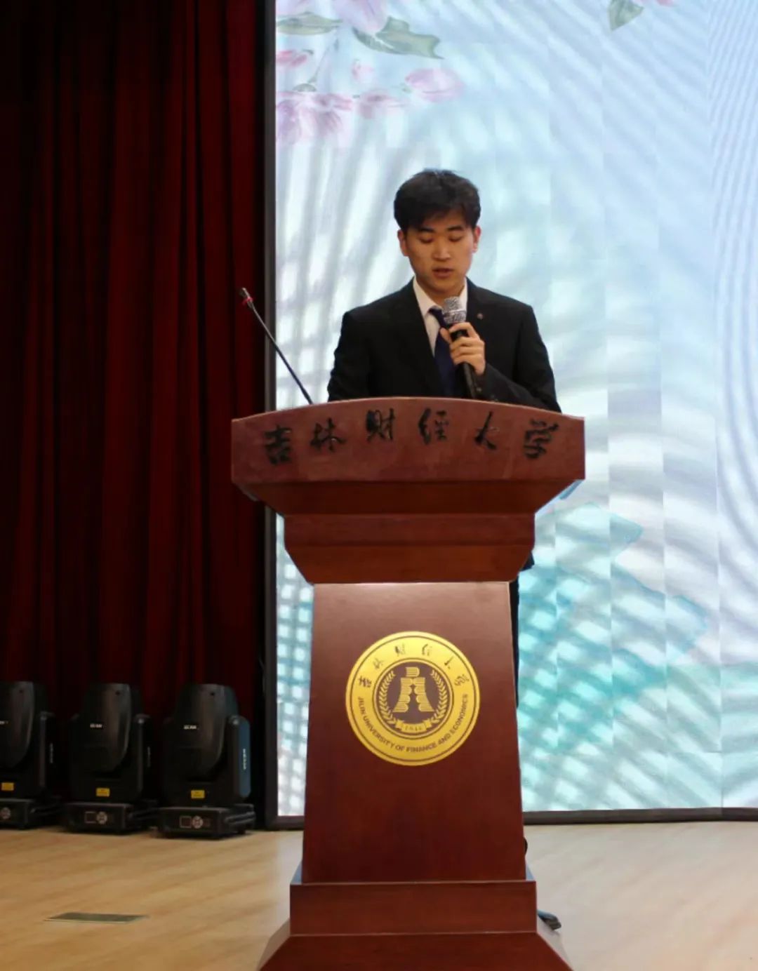首先,由三位18级优秀毕业生通过线上的方式为我们分享学习生活经验,他们分别是吉林省“优秀大学生”、校“十佳大学生”来自税收1804班的贾婧瑶,目前在兰州大学攻读硕士研究生;财政1884班团支书苏来亚,现就职于国家税务总局鄯善县税务局;现任职于华为财税部门的税收1803班徐祥发。三位优秀毕业生在视频中表达了自己对母校的思念、对老师们的挂念、对校园生活的怀念,同时表达了对母校辛勤培育的感恩之情。为了鼓励学弟学妹们更清楚的了解自己,更正确规划自己的学习生活,为自己以后人生的发展奠定良好的基础,他们通过自己的亲身经历来鼓励在座大学生进一步积极向上、刻苦学习、勤于行动、不惧艰辛、不畏失败,不断扎实自己的专业知识、提高自己的核心竞争力、提升自己的综合能力,激励大家成长成才。