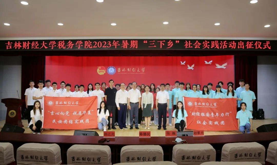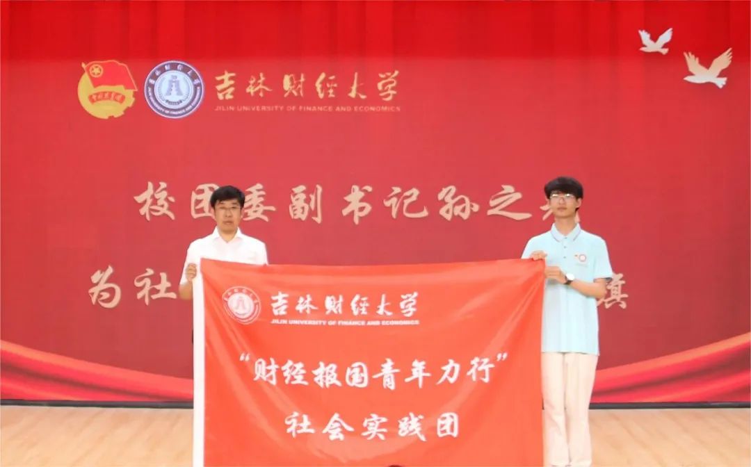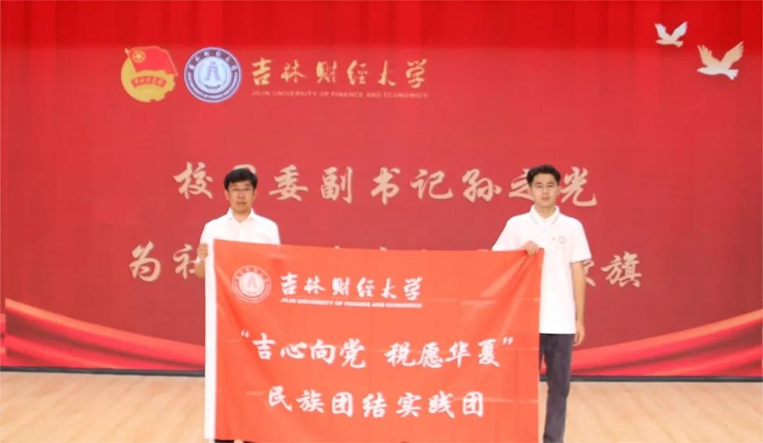 随后,校团委副书记孙之光为“吉心向党,税愿华夏”民族团结实践团和“财经报国青年力行”社会实践团授旗。