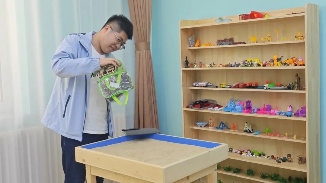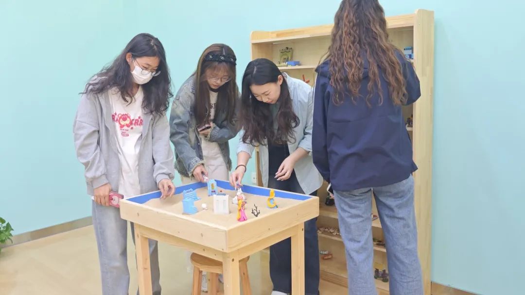 接下来体验的场地是沙盘游戏室,同学们在这里进行趣味活动。沙盘游戏室是心理咨询师运用沙盘来进行心理辅导的场所。同学们通过使用沙盘或者各类模型来表达内心感受,从而达到释放压力的效果。