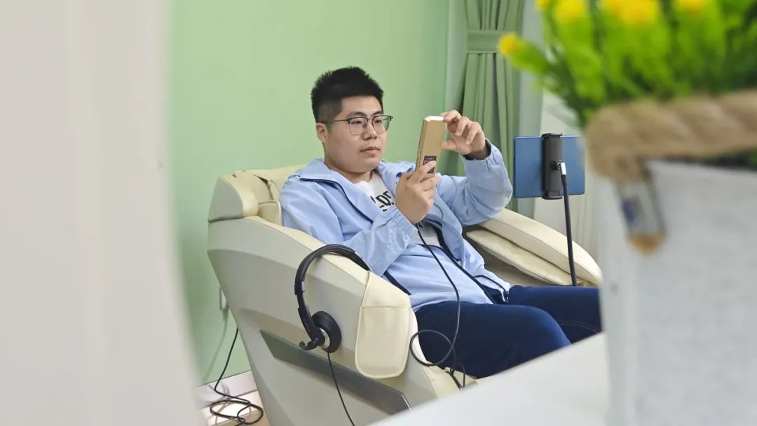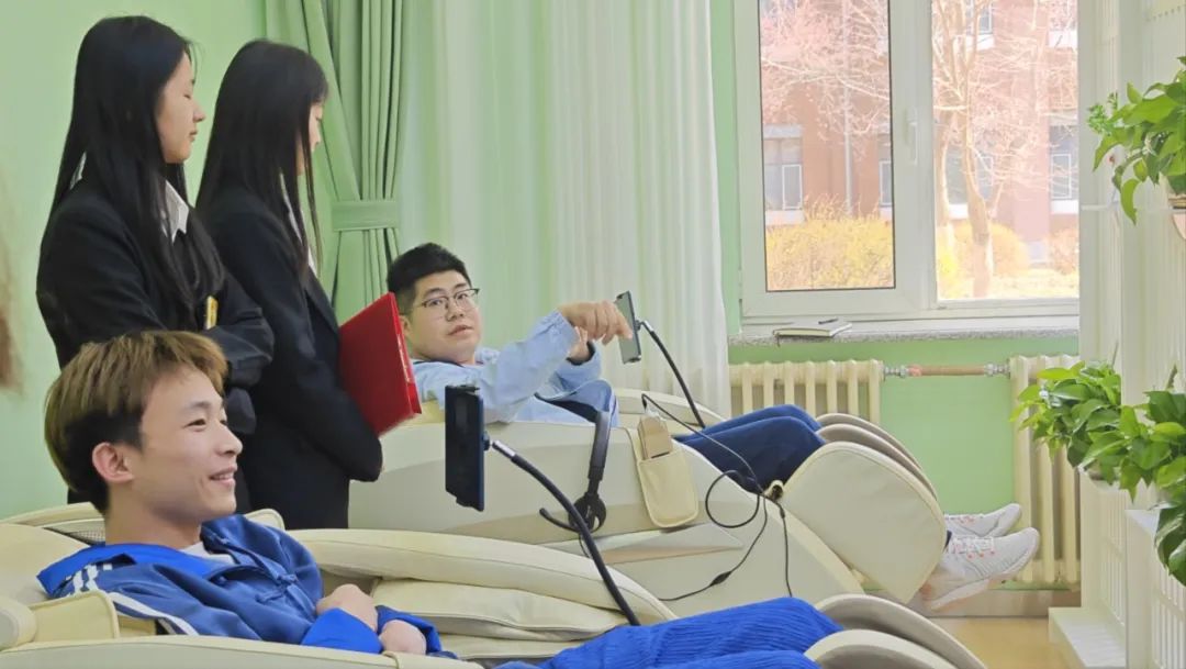 随后同学们进入音乐放松室进行放松活动。音乐放松室内配有按摩椅,可以舒缓同学们的身体压力,在按摩椅上并配备平板电脑和耳机,在享受按摩的同时可以听音乐放空自己,享受这一刻的宁静和欢愉,充分缓解精神疲劳。