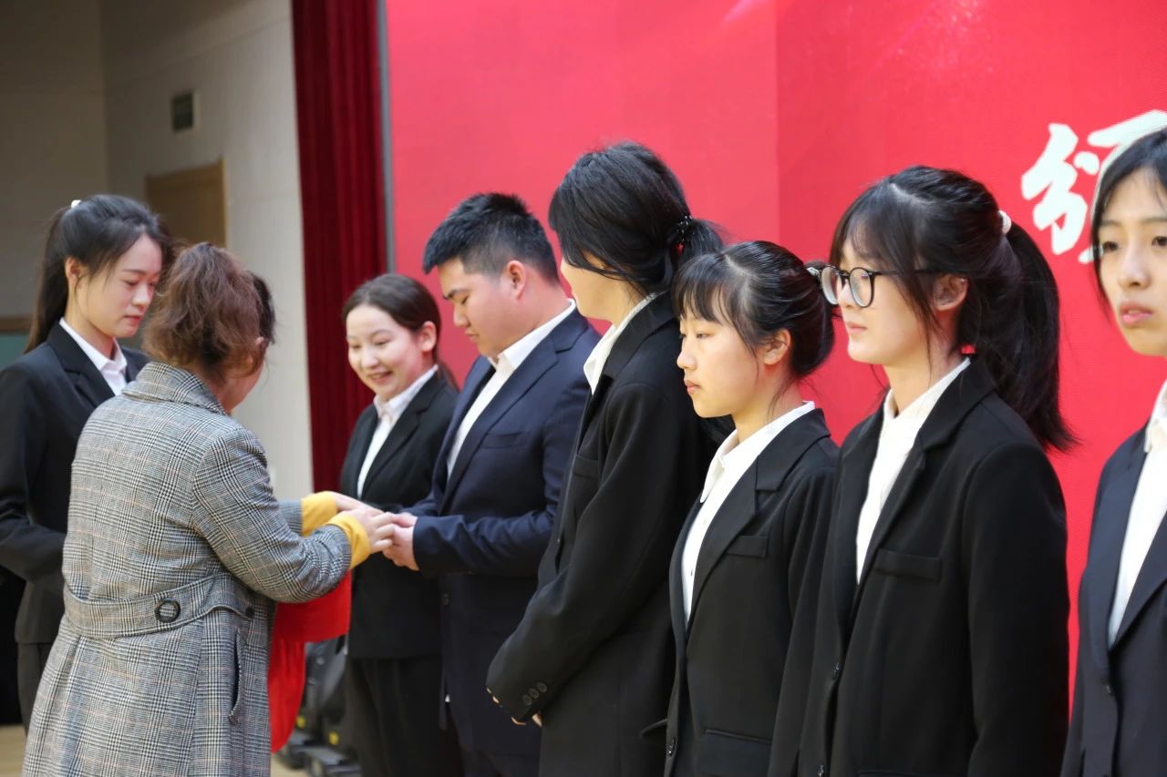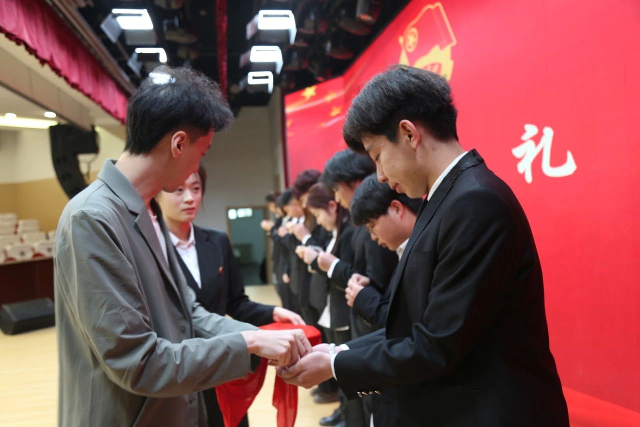 天美传媒 团委副书记李广野老师、学院团委努尔妮萨老师、王家赫老师为新团员颁发团徽。