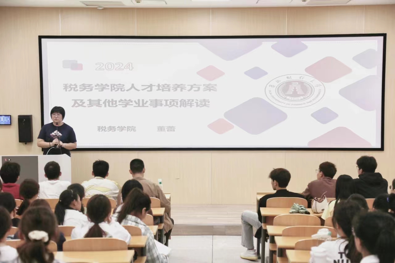 讲座中董蕾副院长为同学们详细地介绍了学院三个特色专业的培养目标与发展前景,引导各专业学生认真学习并掌握税收相关理论知识,了解我国财经运行情况,具备运用专业知识分析和解决问题的能力,培养大家成为复合型高素质的税务人才。此外,董蕾副院长还介绍了之后学院拔尖创新班班级的选拔方式、学生转专业的要求以及带领同学们分析我院研究生推免的政策,为不同选择的他们提供全方位的帮助,帮助新生更好地明确发展目标、做好未来筹划。