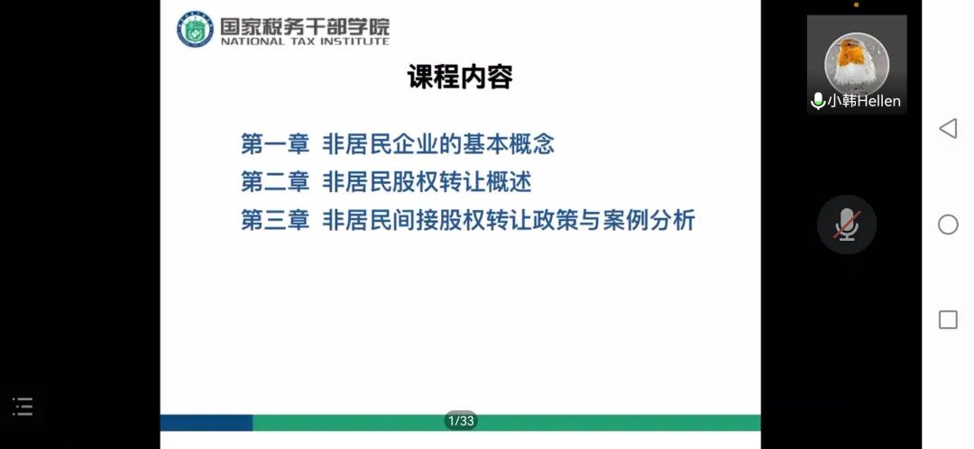 本次课程韩凌宇老师为同学们讲授了“非居民间接股权转让税收问题”的相关知识。首先,韩老师讲解了非居民企业相关概念,概述了非居民税收管理工作的流程。其次,韩老师以图解的方式描述了非居民股权转让的三种基本模式,并将三种模式分类为直接股权转让和间接股权转让,同时分析了关于股权转让的细节性技术问题。最后,韩老师从基本概念、特征、中国和国际的应用三方面讲授了一般反避税规则,并结合“沃尔玛收购好又多的非居民企业所得税征税方案”的典型案例对非居民企业间接股权转让实例做出详细的分析。