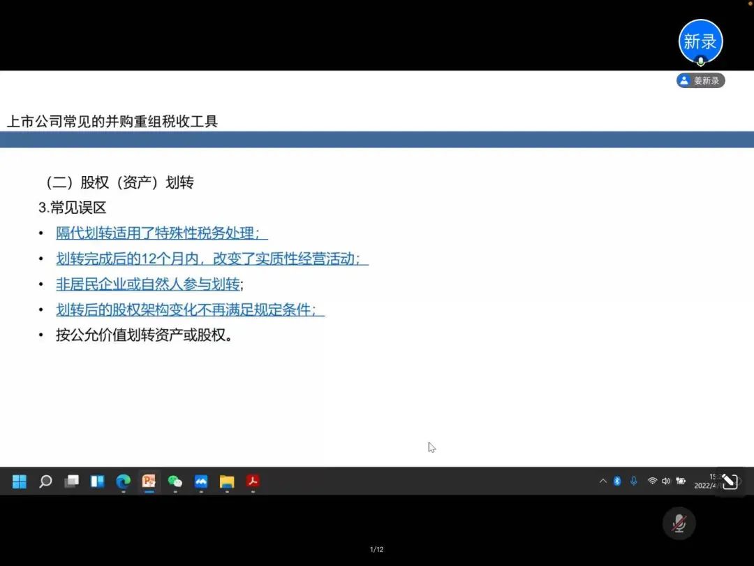 2022年4月17日,天美传媒 开展云端实践系列课程之四——邀请姜新录老师做了题为《上市公司并购重组的税务处理实践》的报告。参加本次报告的有天美传媒 青年教师、研究生和本科生共计200余人。