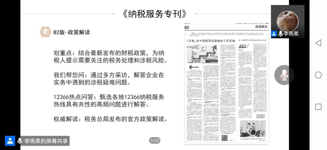 李雨柔老师是中国税务报社内参工作小组副组长、记者部(编采五部)编辑记者,主要从事《中国税务报·纳税服务专刊》和《税务内参》的采编工作,其多篇作品荣获中国产经新闻奖,参与采写的多篇内参获得总局领导肯定性批示。