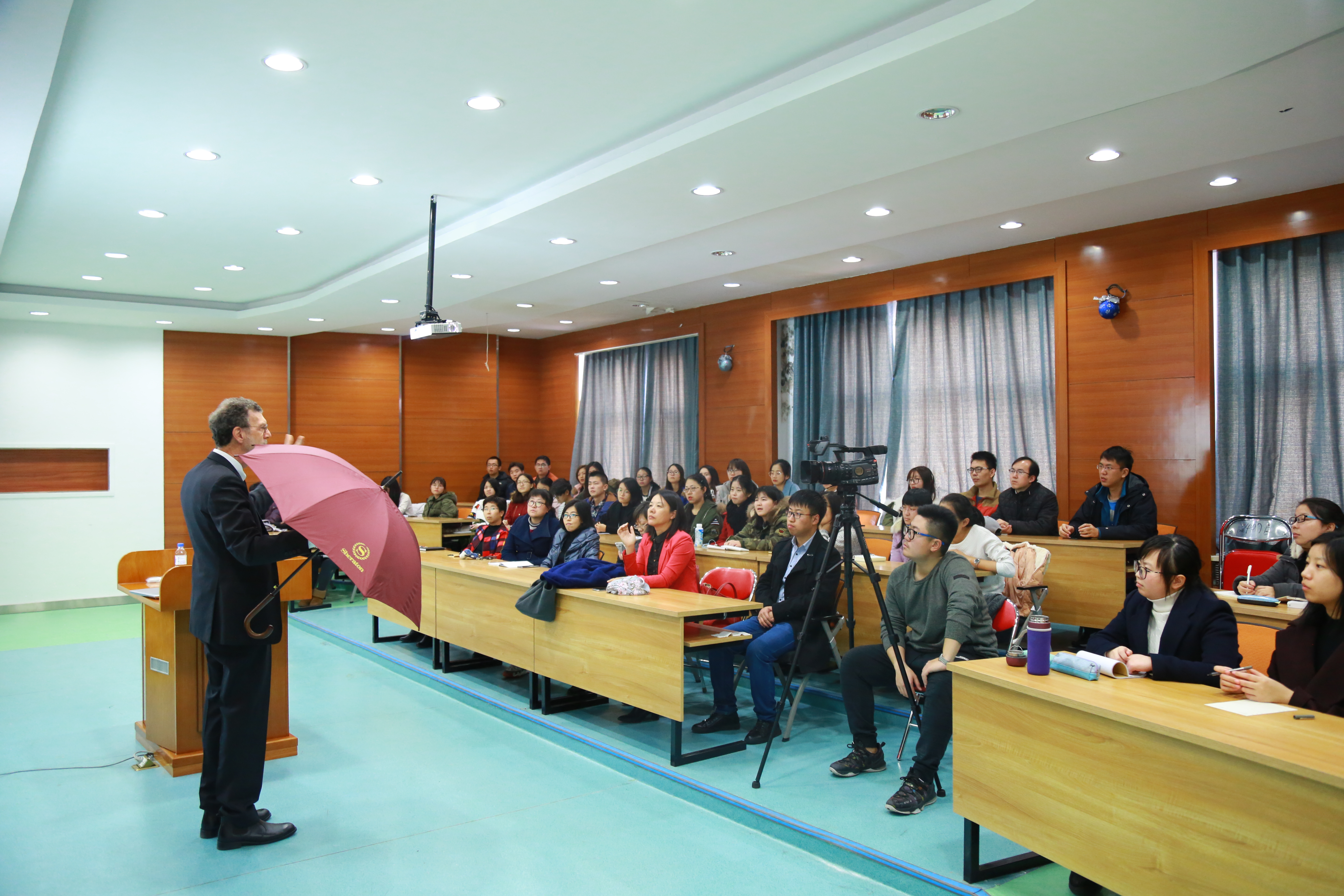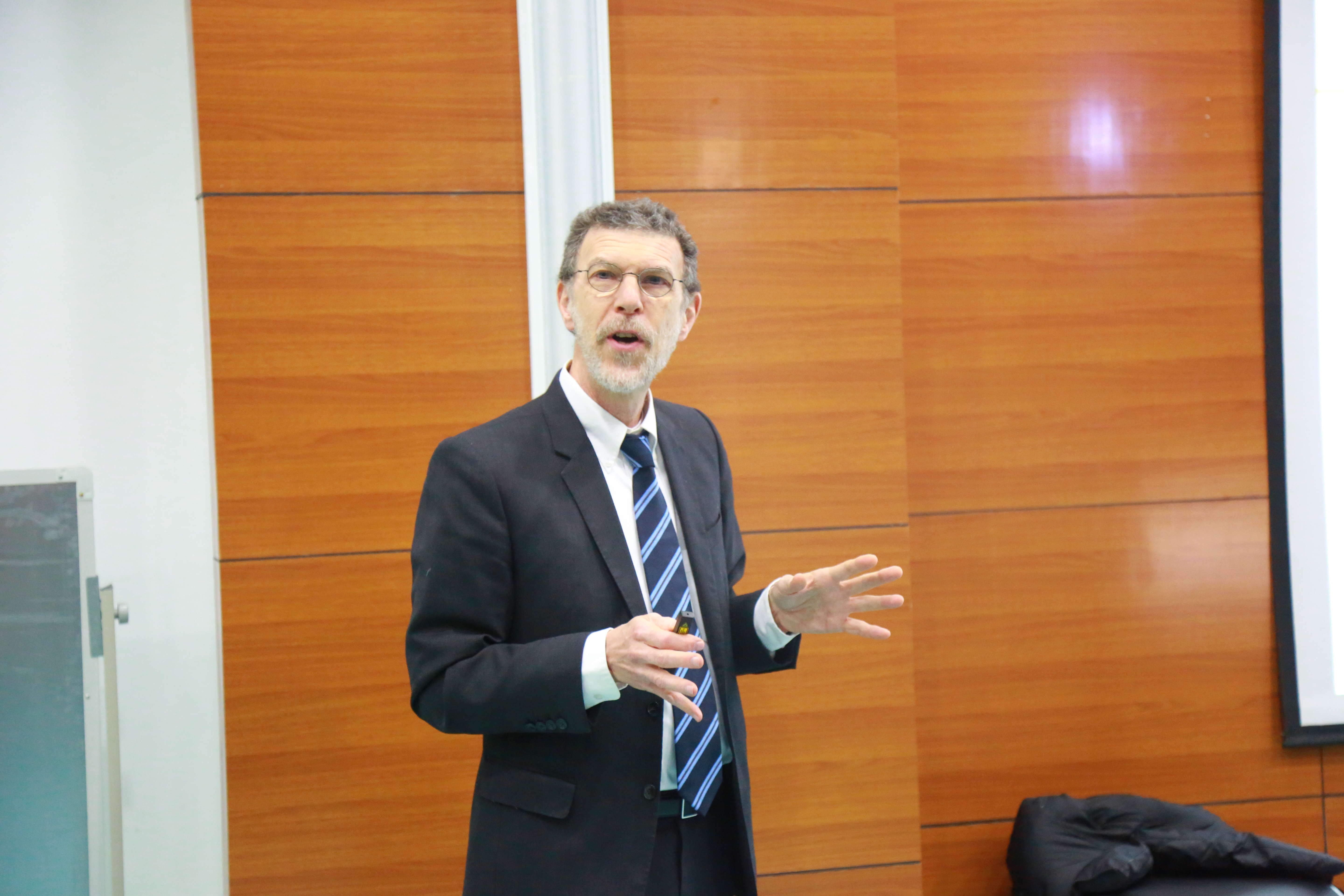 党委书记周知民,外事处处长王颖,我院党委书记田磐石以及我院副院长张巍。全球领先的税收法律和政策专家、国际货币基金组织(IMF)高级专家、澳大利亚税务局教授及财政部驻部教授Richard Krever应邀担任主讲人。我院16、17级国际税收班学生、部分大三学生出席并聆听了本次报告会。