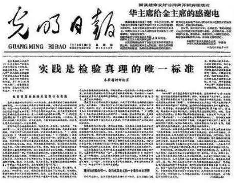 1978年5月10日,中央党校内部刊物《理论动态》第60期发表经胡耀邦审定的《实践是检验真理的唯一标准》一文。5月11日,《光明日报》以特约评论员文章的形式发表。当日,新华社转发此文。12日,《人民日报》《解放军报》以及《解放日报》等全文转载。这篇文章鲜明提出:社会实践不仅是检验真理的标准,而且是唯一的标准。这篇文章在广大干部群众中引起强烈反响,一场规模宏大、内涵丰富、影响深远的关于真理标准问题的大讨论,在全国轰轰烈烈地展开。这场大讨论,冲破了“两个凡是”的严重束缚,重新确立马克思主义的思想路线、政治路线和组织路线奠定了理论基础,成为实现党和国家历史性伟大转折的思想先导。