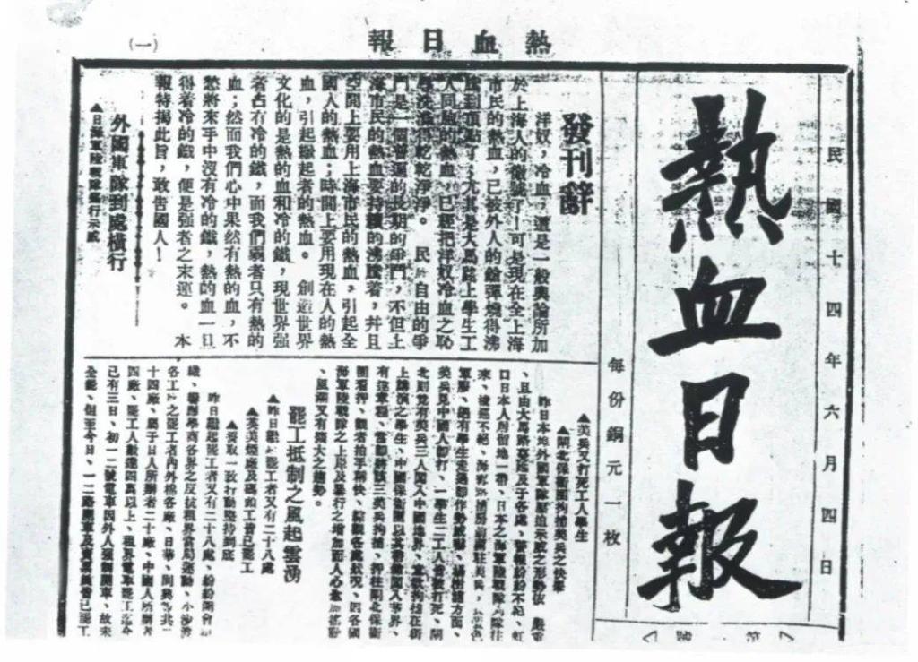 1925年6月4日,中国共产党历史上的第一份日报《热血日报》创刊,由瞿秋白主编。《热血日报》及时宣传报道上海和全国各地反帝反封建的群众爱国运动,坚持正确舆论导向和战斗性。它在中国现代革命史和新闻史上写下了光辉的一页。
